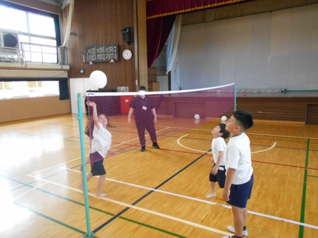 本日4時間目の体育の様子です。準備体操では、綺麗に一列に整列して体育係の子を中心に大きな声で行うことができました。ボール遊びでは、バレーボールでレシーブ練習やミニゲーム、風船を使ってチームで名前を呼びながら落とさないように上げたりと体全体を動かしながら楽しむことができました。