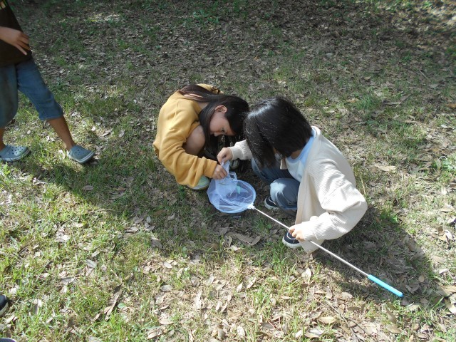 本日の1時間目生活単元の様子です。虫かごをもっていきものを探し、友達と「〇〇いたよ!」と見つけたいきものをみんなで観察する姿が見られました。捕まえたいきものは虫かごの中にいれて観察し「何を食べるんだろう」と興味を持つことができました。
