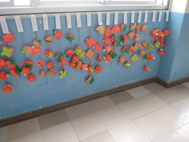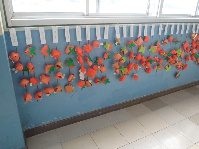 1年生の廊下に柿がたくさん吊るされています。生活科の時間に季節を感じながら色紙と色画用紙を使って作りました。朝晩は少しずつ涼しさを感じるようになり秋を感じることができるようになりました。