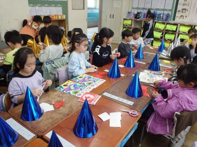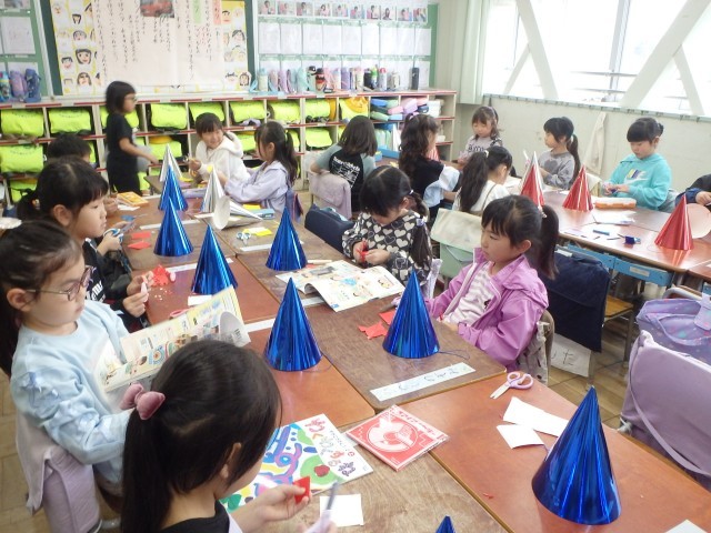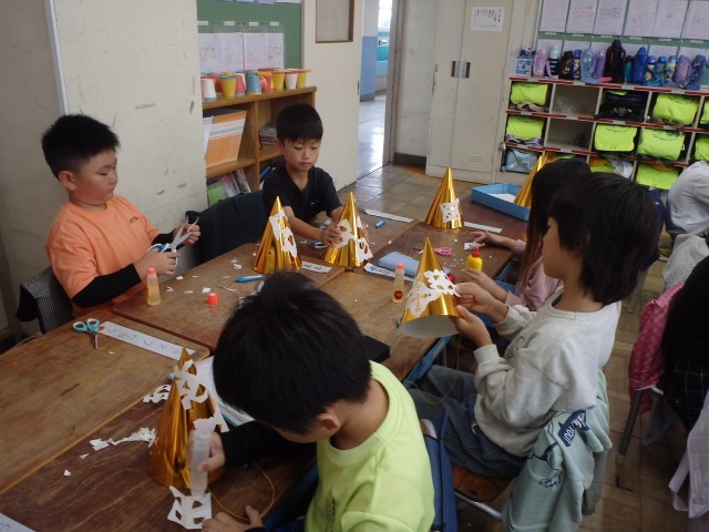 いよいよ学習発表会まで1か月となりました。せりふの練習も頑張っている1年生ですが、この日は演目の中で使う帽子を作りました。1学期の図工の学習で行ったことが生きてきました。日に日に、演目の楽しさに引き込まれている1年生です。