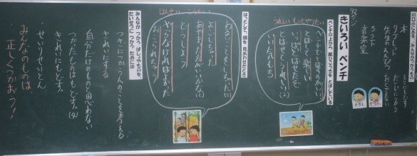 10月25日は、道徳地方地区公開講座でした。2年2組では、「きいろいベンチ」という資料から、身の回りにあるたくさんの「みんなの場所や物」について振り返りました。みんなで使う場所や物を、大切に使うためにはどのように使えばよいのか、みんながうれしくなるためにはどうであればよいのかをみんなで考え、みんなのものを大切にしようとする心情を育みました。みんなの場所や物を正しく使って、みんながうれしくなるようなクラスを、これからも目指していきます。