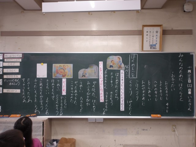 「しごと」という言葉から子供たちは「お手伝い」ということを思いつきました。そこから「いつもしているお手伝いは何?」ということを投げかけ授業をスタートさせました。お皿洗い・お風呂掃除・部屋の掃除・・・子供たちから自分たちがしているお手伝いがたくさん出てきました。教材文の中のひろきくんがお風呂掃除をして家族の役に立った喜びをクラスで共有しました。