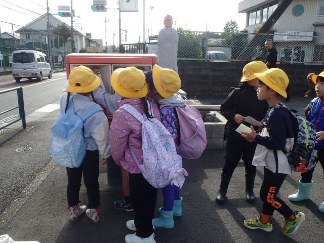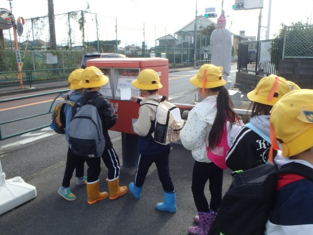 今日は、1・2年生でさつまいもほりに行きました。畑に行く前に学校の近くのポストに寄りました。先日、手紙の書き方教室で書いた葉書を投函するためです。自分で書いた葉書を自分で投函しました。無事に届きますように・・・