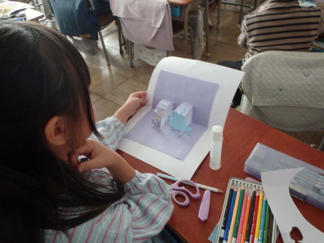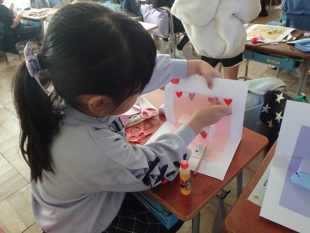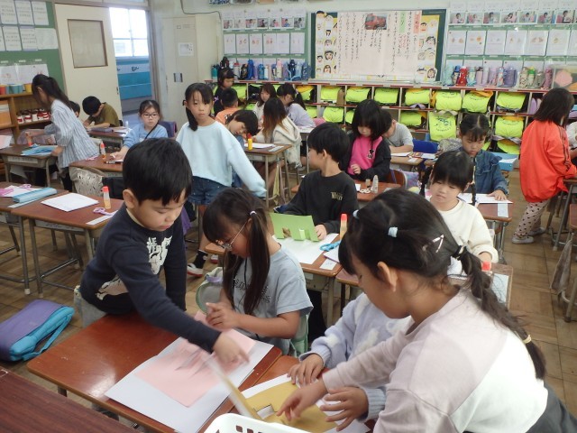 学習発表会の本番がどんどん近づいてきています。1年生は、おうちの人に向けて招待状を作り始めました。飛び出すカードにしています。どんな作品になるのか完成がとても楽しみです。