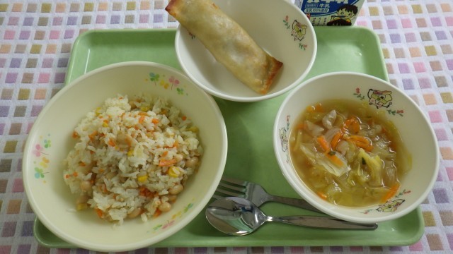 給食室でりんごの皮をむき、蒸してつぶした八王子産のさつまいもと砂糖などを加えて、煮たものを春巻きの皮で包み、焼いたパイを作りました。