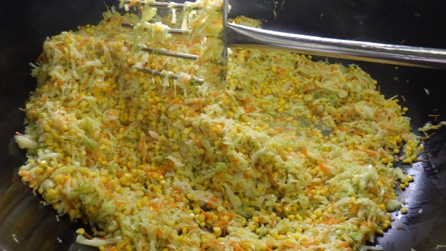コールスローは包丁で千切りに切ったキャベツ、コーンなどを茹で、加熱しながら作る手作りのフレンチドレッシングと一緒に加熱して作ります。酸味が強いサラダなのですが、キャベツやコーンの甘みがあるからか野菜料理の中では、よく食べてくれる料理です。