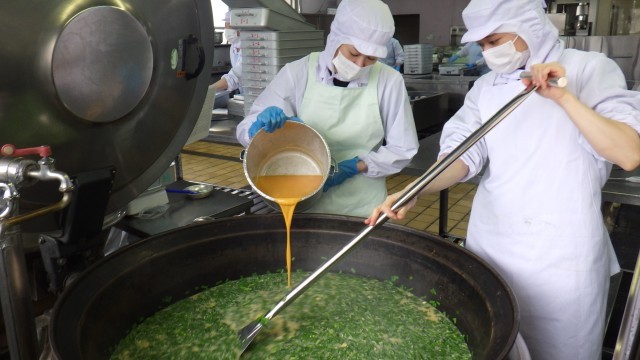 今日は五つ星献立です。スポーツ選手が身体づくりのために心がけている食事と同じ「主食(ごはん)・主菜(豚肉のしょうが焼き)・副菜(茎わかめともやしのピリカラ炒め、にらたまみそ汁)・果物(みかん)・乳製品(牛乳)」がそろった献立です。