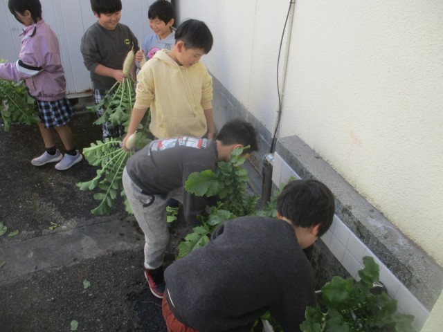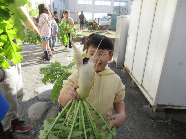 大きいものや小さいもの、二股大根など、いろいろな大根が収穫でき、自分たちで水洗いまでしました。