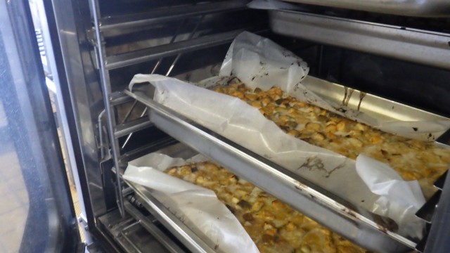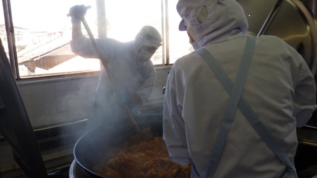 大豆入りトマト味の具を混ぜた、大豆ピラフを作りました。炊きあがったご飯に、ムラがないように気を付けながら、大きな釜で具材を混ぜ合わせます。