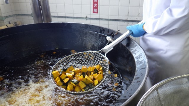 有機野菜とは、化学的につくられた肥料や農薬を使わずに、なるべく生き物や環境への負担を掛けないように作った野菜です。学校給食畑では、給食で使う有機野菜を育てています。そこで収穫されたかぼちゃを、素揚げにしカレーに入れました。かぼちゃの甘みとカレーの辛さが丁度よく、食べやすいかぼちゃ料理です。