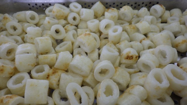 きりたんぽは、秋田県大館市で江戸時代から親しまれている家庭料理です。比内地鶏のだしに地元の具材を加えて作る鍋料理で、ごはんをつぶして串にさして焼いた「きりたんぽ」を入れます。今日の給食では、削り節でだしをとり、鶏肉・八王子産の大根・小松菜・にんじんなどを入れた、きりたんぽ汁を作りました。