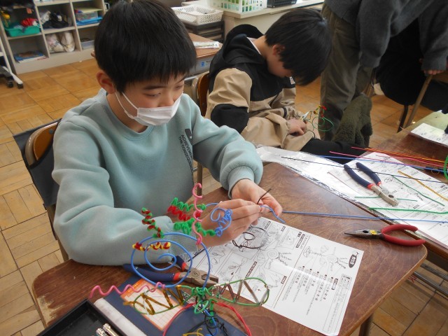 本日の図工の授業では、カラー針金を使った工作を楽しみました。お手本を見ながら真剣に作る姿や、自分で考えたものに挑戦して作る姿が見られました。