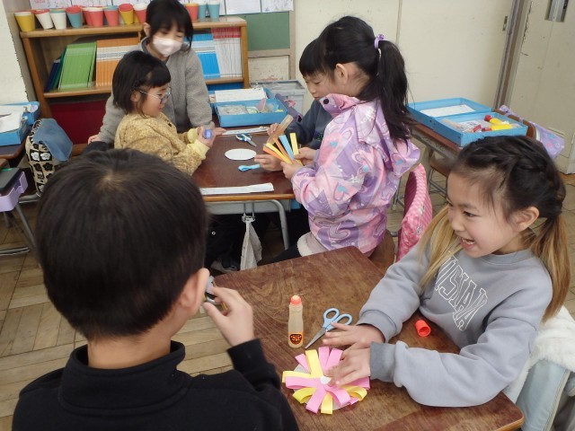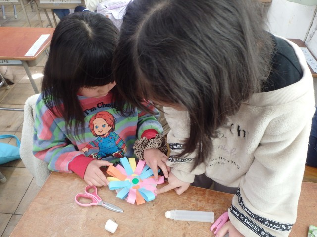 2月に入り、幼稚園や保育園の年長さんを学校に招待する日が何日かあります。プレセントを作っている様子です。丸い紙の上に色画用紙を細く切った物を貼っていきました。お花の完成です。心を込めて作りました。