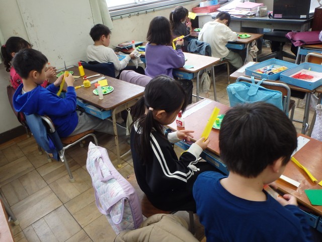 2月に入り、1年生は新一年生の入学に向けて教室や廊下に飾るものを作っています。この日は、たんぽぽのお花畑を作りました。黄色い折り紙を切って、切り込みを入れて巻いていくと・・・あらあら不思議、たんぽぽの出来上がりです。緑のお庭にボンドで付けていっています。素敵な飾りが完成するのが楽しみです。