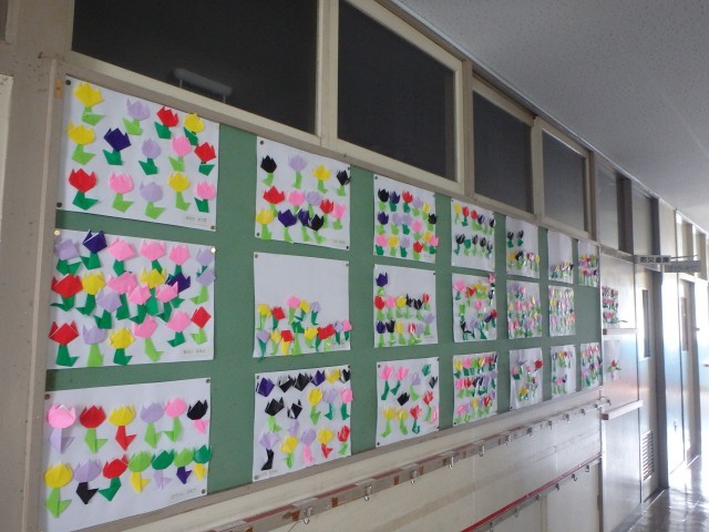 一年生の靴箱を出ると2年生が植えたチューリップが素敵な花を咲かせています。生活科で学校探検をしたときに見つけた一年生。早速、季節を感じながら折り紙で作ってみました。色とりどりのチューリップが廊下に咲き始めています。