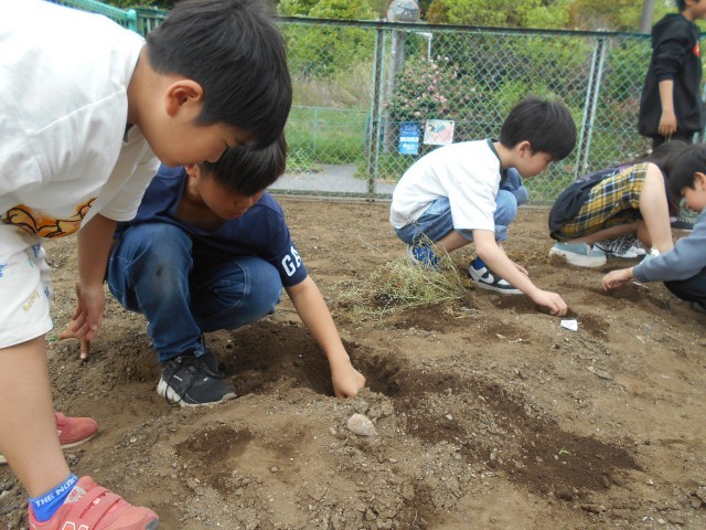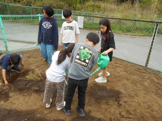 本日の生活単元では、畑に穴を掘りじゃがいもを植えました。自分が植えたじゃがいもが大きく育つことを楽しみにする子や、低学年の子に水やりの仕方を教える高学年の子の姿が見られました。