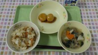 5月16日(月)五穀ごはん、鶏肉のピり辛焼き、のっぺい汁、じゃこと野菜のにんにく風味、くだもの(清見オレンジ)、牛乳