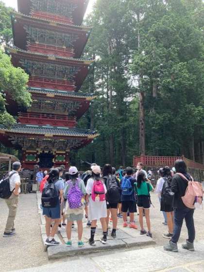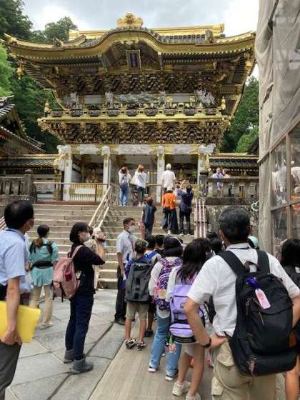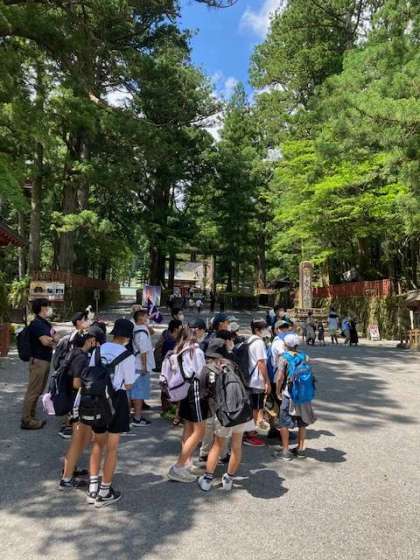 クラスごとにガイドさんの説明を聞きながらゆっくり見学をしました。他の学校や団体がいなかったので、貸し切り状態で見学し記念撮影も待つことなく撮れました。曇っていたので体調を崩すこともなく元気に見学しました。これから華厳の滝に向かいます。