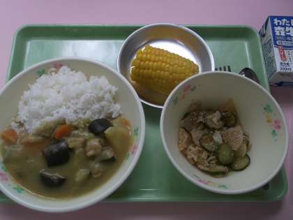 7月4日(火)夏野菜のカレーライス、大根ごまサラダ、蒸かしとうもろこし、牛乳