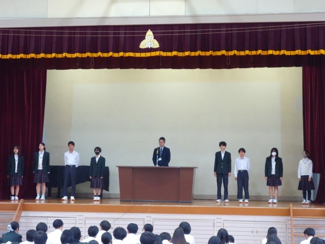 旧役員からは1年間のまとめ、また新役員から新たなスローガンである「切磋琢磨」の紹介、力強い宣誓がありました。今後の学校生活を明るく楽しく過ごす期待が込められていました。
