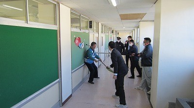 訓練では、職員が声掛けによる初期対応を行った後、突破されるとの想定のもと、複数の職員が連携し、さすまたを用いて不審者を確保しました。生徒は教室内で机やいすを使ったバリケードを作り、出入口から見えにくい位置に移動するなど、身を守る行動を取りました。不審者役の大きな声が響く場面もありましたが、生徒たちは私語をせず、落ち着いて訓練に臨むことができました。