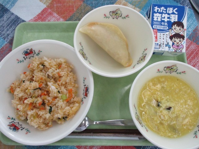 キムチチャーハンは、お子さんでも食べやすいように辛さを控えめに仕上げました。こまつな・にんじん・鶏ひき肉も入っていて、具沢山なチャーハンです。ツナポテトぎょうざは、調理員さんがひとつひとつ丁寧に包んでくれました。蒸してつぶしたじゃがいもとツナを合わせた具がたっぷり入った、子供にも大人にも大人気の献立です。