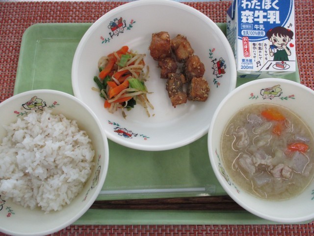 今日は旬の小松菜をたくさん使った「小松菜とにんじんの和え物」をいただきました。旬とはその食べ物が1番おいしくて状態がいい時期です。「今日の給食の小松菜は今が1番おいしい時期ですよ」と児童に呼びかけると、「野菜増やしたい!」という声が飛び交い、野菜をたくさん食べてくれました。青菜系の野菜は苦手意識が高くなりがちですが、おいしい時期に食べると「おいしいかも・・・食べられそう・・・!」と感じ、苦手を克服できるかもしれません。