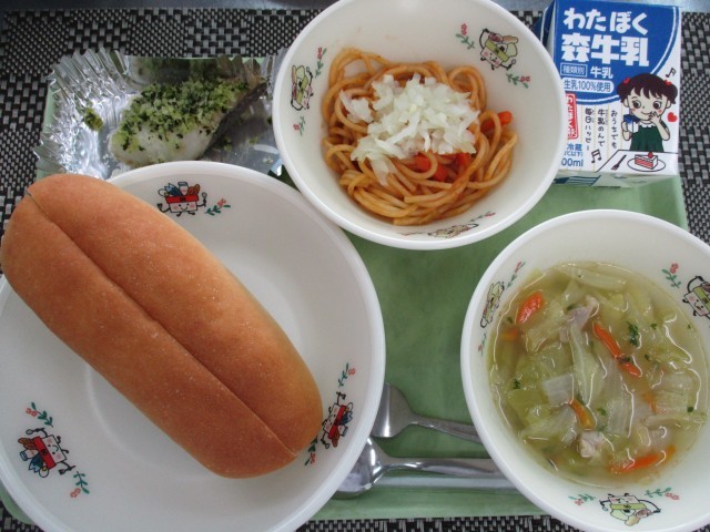 八王子ナポリタン(通称はちナポ)とは八王子のご当地グルメで、刻み玉ねぎがトッピングされているのが特徴です。また、八王子産の食材が使用されています。給食で作るはちナポは、ケチャップ、みそ、さとう、にんにくを入れて味に奥行きを出しています。今日はコッペパンにサンドしていただきました。はちナポは子どもたちからも大人気で、みんなが楽しみにしていた献立です。量を増やしたり、おかわりしたりなどたくさん食べている児童がたくさんいました。放送で「パンにナポリタンを挟んで食べるとおいしいです!」と呼びかけると、上手にはちナポを挟んで食べていました。もちろんナポリタン単体で食べても美味しいので、パンに挟まずにはちナポを味わっている児童もいました。
