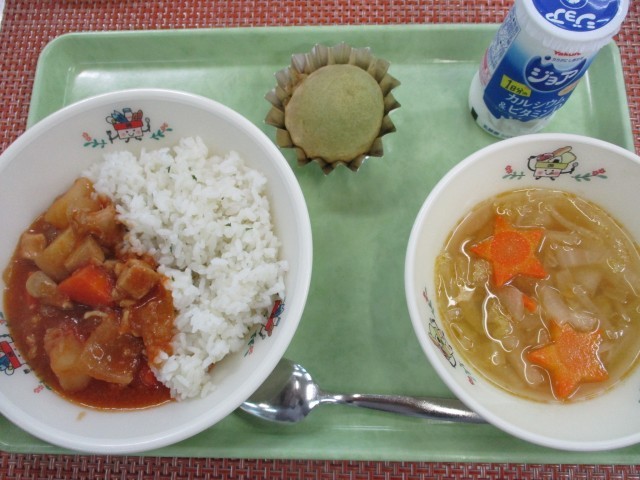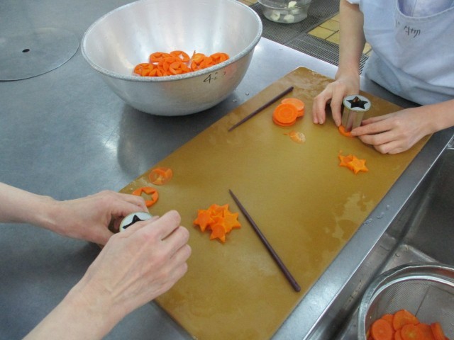 今日は今年最後の給食でした。今日はクリスマスイブなので、クリスマス献立です。チキンのトマト煮込みや桑都カップケーキでクリスマスらしさを出しました。桑都カップケーキは桑の葉パウダーを使用しています。抹茶のような風味が感じられるカップケーキです。写真2枚目はにんじんを星形にくりぬいている様子です。クリスマスということで見た目にかわいらしさを出したいと思ったので、星形のにんじんをスープに入れました。また、久しぶりにジョアを提供しました。ジョアが大好きな児童が多く、給食を食べ始めて早々に飲み干してしまう児童がたくさんいました。ジョアにはいろいろなフレーバーがあるので、何が好きかという話にもなりました。(いちご味が人気でした。)