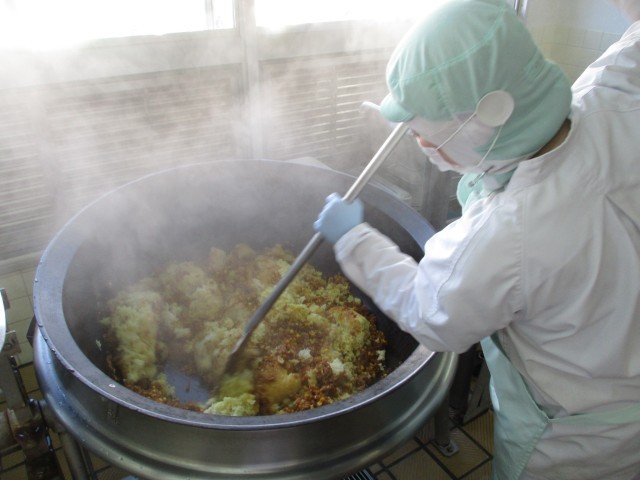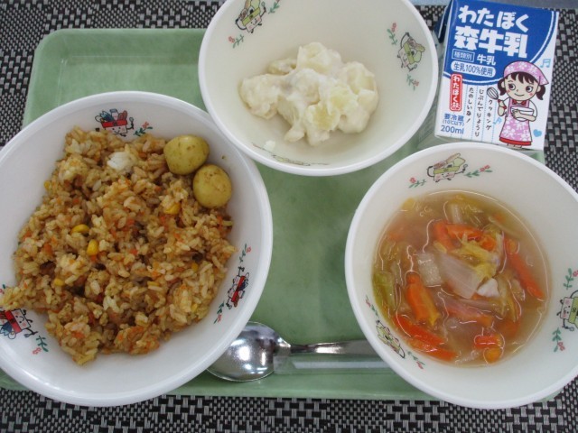 写真3枚目はカレーピラフを調理している様子です。玉ねぎ・ピーマン・にんじん・コーンが入っています。ピラフの具材を作っているときはピーマンの香りが強く感じられましたが、実際に食べるときはピーマンの風味や味が強調されていませんでした。ピーマン苦手な子でも気軽に食べられるピラフだと思います。実際に給食でも「ピラフおいしい!」とたくさんの児童がほめてくれました。