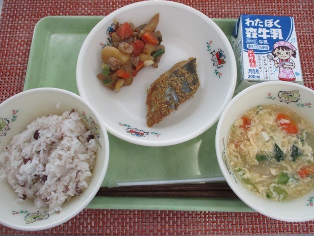 今日の給食は「小正月献立」です。小正月とは1月15日、または15日前後の数日間のことです。元日を含む「大正月」に対して、正月の終わりのこの時を「小正月」と呼びます。小正月には餅花という柳などの枝に小さく丸めた餅やだんごを刺したものをかざります。また、小正月の朝には、1年中病気をしないようにと「小豆がゆ」を食べる習慣があります。これにちなみ、給食では「あずきごはん」をいただきました。もち米も入れたので、もちっとして食べ応えがあるごはんに仕上がりました。