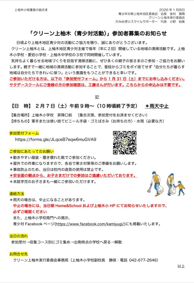 ※今年度も、ゆずっこひろばスタッフの皆さまにご協力いただき、当日サタデースクールに参加している児童および参加可能な保護者の方に、クリーン上柚木の活動へご参加いただきます。