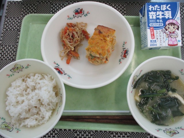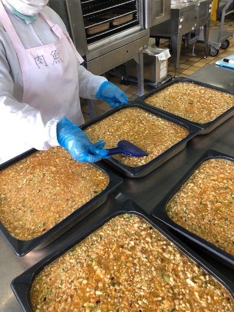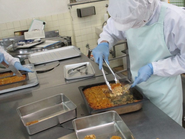 今日は擬製豆腐をいただきました。擬製豆腐とは、崩した豆腐に野菜や卵、肉(ひき肉)、調味料を混ぜ合わせ、型に流すなどして焼いた食べ物です。今日の給食では豆腐のほかに、卵、しいたけ、にんじん、たまねぎ、ねぎを入れました。写真2枚目は、液を型に流している様子です。型に流した後に、きれいに仕上がるようにへらで表面を平らにしています。この後オーブンに入れて、低温でじっくり焼きました。写真3枚目は出来上がった擬製豆腐をカットして、各クラスのバットに配缶している様子です。プルプルに仕上がったので崩れやすく、配缶するのが難しかったです。食べてみると、卵の甘味と野菜・しいたけのうま味が口いっぱいに広がります。豆腐が入っているので口当たりがなめらかでした。