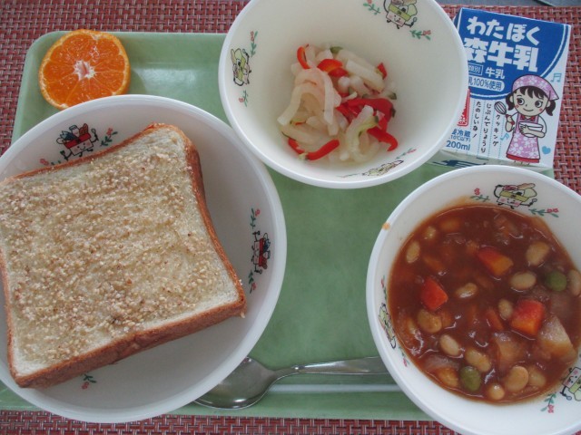 今日はイタリアで開催される冬季オリンピックにちなんだ献立を提供しました。イタリア料理によく使用されるトマトを使ったポークビーンズ、イタリアの国旗をイメージしたイタリアンサラダをいただきました。写真2枚目は、イタリアンサラダを調理している様子です。緑、白、赤できれいなサラダに仕上がりました。教室ではセサミトースト、ポークビーンズ、サラダ全品おいしいと大好評でした。