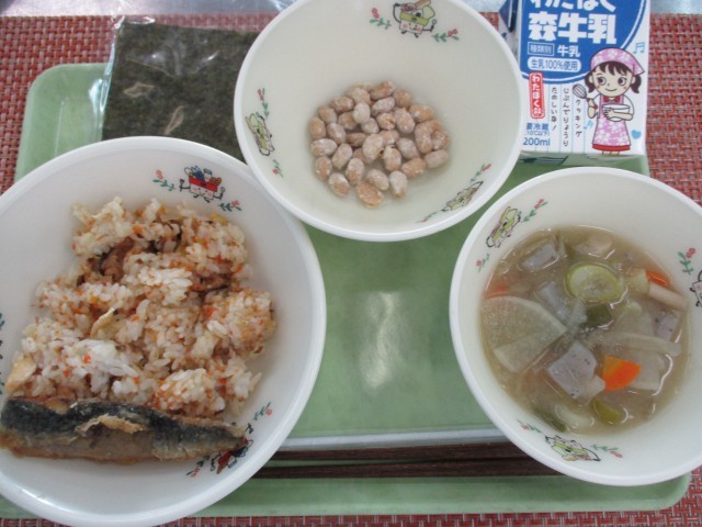 今日は節分献立でした。セルフでごはんに海苔を巻いていただきました。今年の恵方は南南東です。南南東方向を向いて恵方巻きを食べていた児童もいました。
