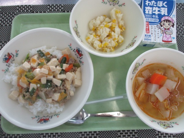 今日は野菜がたくさん入っている給食です。野菜は1日に350g食べるとよいと言われています。生野菜は量が多く感じてしまい少し苦しくなるかもしれませんが、スープやおかずに入れるなど調理することによって、食べやすくなります。今日の給食では特に四川豆腐丼の残菜が少なかったです。豆腐がメインですが、野菜もたくさん入っています。