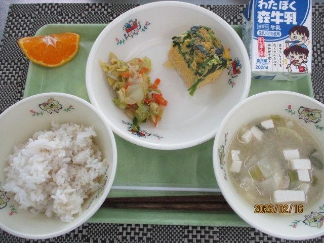 千草焼きにはほうれんそう、たまねぎ、にんじんが入っています。たまご(赤の仲間)とやさい(緑の仲間)が一度に美味しく食べられる、大人気の献立です。
