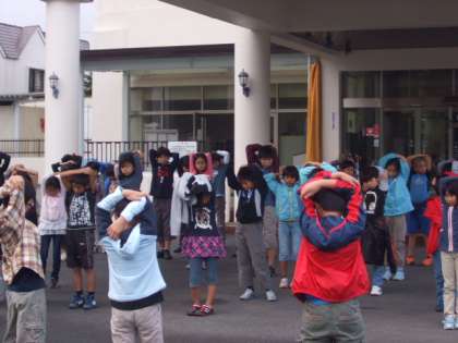 ここでは、雨が降ってひさしの下で朝の会を行いました。