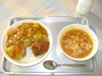 チキンカレーライス 福神漬け トマトスープ 牛乳