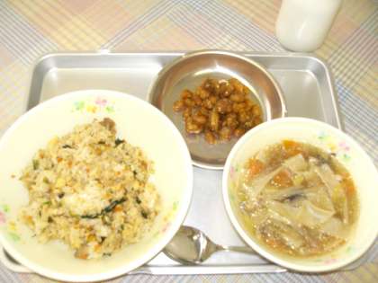 チャーハン ワンタンスープ 鶏肉と大豆の揚げ煮 牛乳