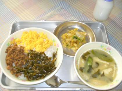 三色ごはん みそ汁 ピリカラ白菜 牛乳