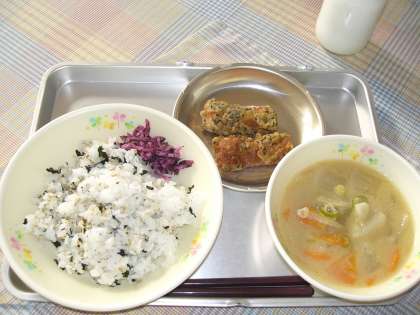 わかちりごはん ちくわの石垣揚げ 根菜ごま汁 ゆかり大根 牛乳