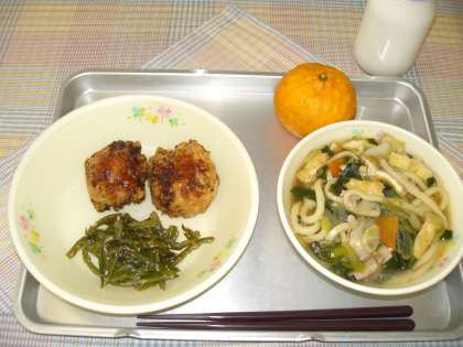 五目うどん 揚げたこボール 茎わかめのにんにく炒め 果物 牛乳