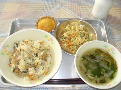 中華風炊き込みごはん 水菜のチャンプルー もずくスープ ミニマドレーヌ 牛乳