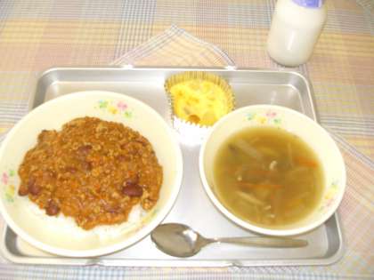チリコンカンライス きのこスープ りんごのクラフティー 牛乳