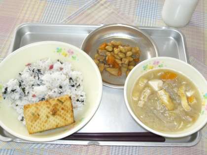 梅若ごはん いかの香味焼き 五目煮豆 みそけんちん汁 牛乳