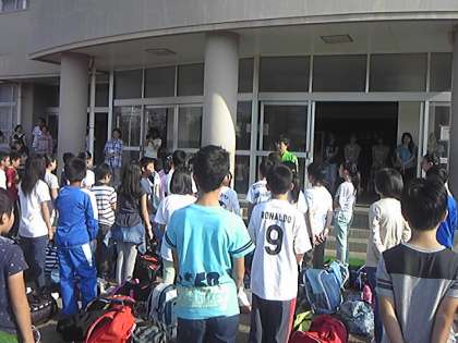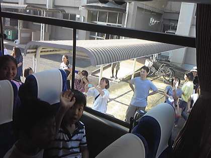 快晴!暑いぐらいの出発式を終えて、スタートです。高原は、涼しいかなぁ…。2日間、よろしくお願いします。