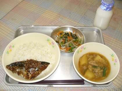 ごはん さばの韓国風味噌煮 カムジャタン 3色ナムル 牛乳