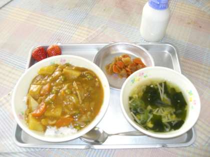 カレーライス 福神漬け わかめスープ 果物 牛乳