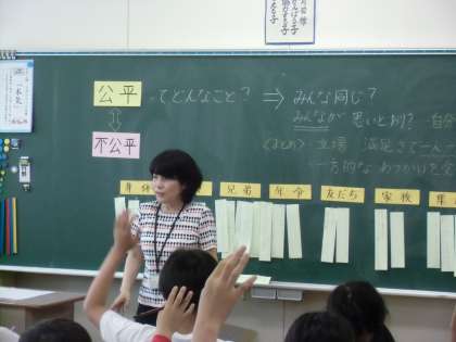 3時間目に6年1組が町田校長先生と道徳の学習をしました。『「公平」ってどんなこと』について、一人一人が考え、グループで議論し、自分が考える「公平」についてまとめました。